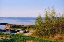 Setting out in the morning on day three of my bike ride, I soon climbed onto the highlands above the dam to see the calm waters of the bay they call 'La Grande Décharge'. I still could not see the lake. It was only when I reached the village of Taillon that I had my first, panoramic view of the lake. It stretched off into the distance like a vast, inland sea. Off in the direction I had come, I could see the distant smoke rising from the factories of Alma. Directly across the lake, I could dimly make out the far shore, and the mountains behind. The 'veloroute des bluets' bike trail leaves the road at Taillon, to enter the provincial park of the same name. I crossed over a small footbridge and found myself at the beach and park headquarters. The beach was, of course, totally deserted on such a chilly, overcast May afternoon. There were many other cyclists however, following the gravel trail as it ran alongside the water, just inside the trees from the narrow beach. I passed many beaver dams, and saw the steel structures that installed under all the bridges, to keep beavers from building there. It was chilly. All the cyclists were dressed like me: heavy sweater, scarf, gloves, earband and goggles. The trail comes out of the park at Sainte-Monique, 'kilometre 0' of the 'veloroute'. A stretch of bike trail follows a wooden right-of-way, built out along the shoreline of the Peribonka river. Then one climbs into town and crosses a special 'bike bridge' over the river, just above the point where its rough waters calm and join those of the lake. Bicycles rejoin the highway to follow right along the north shore of the Peribonka River. I passed by the home of 'Maria Chapdelaine', a famous name in Quebec literature. I passed by the first of many blueberry fields, only just then pushing their brownish shoots up through the soil. At last I came to the town of Peribonka, a tiny waterfront town with a marina and riverside boardwalk. It was here that I would spend the night. |