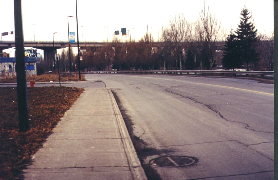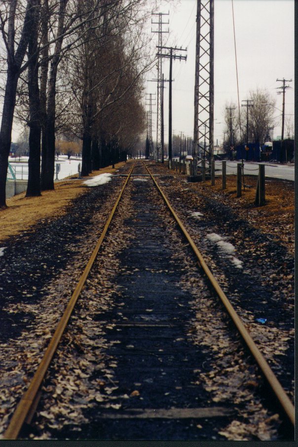 The same view from a block further south, at Angers Street. Only two of the original lines continue. The others are ghosts, evident only in the traces they have left at the street crossings. At this point the line begins to curve eastward, along the highway and aquaduct. Note the pedestrian (bike) way heading off along the expressway at the right. This bears further exploration.