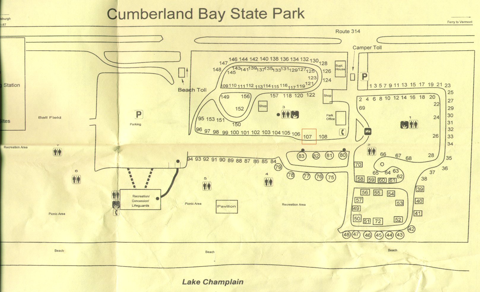 I was actually stopping for the day well shy of Plattsburg town centre. I turned left at the first traffic light, right at the edge of town, and followed the road back along the lakeshore towards Cumberland Head (where there is a ferry to Vermont). About a mile down that road I came to Cumberland Bay State Park. I did not expect there to be a camping problem on such a rainy day, and I was correct. I had my choice of sites. (I had actually made a reservation at Plattsburg RV Park, for Cumberland Bay would not take reservations for only one day. This policy is commonplace and makes life very difficult for touring cyclists, who cannot easily go somewhere else if the park is full. Despite my feelings on the subject, I chose the State park, as it was much nicer for tenting, and was right on the water.)
