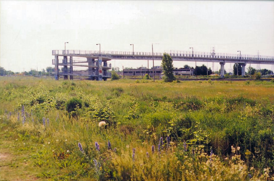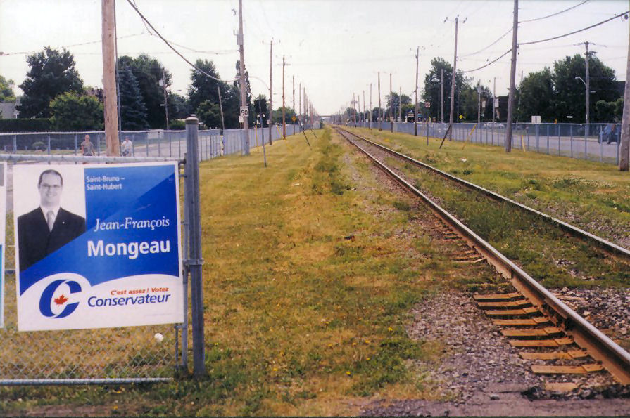 There remains one last bout of suburbia, just beyond the open fields, where the ends of a series of long house-filled streets, descending from Hwy 112 (Boulevard Cousineau) meet Boulevard Kimber. There is a rural crossing of the railroad tracks and, on the far side, a bus turn-around and gravel parking lot. Boulevard Maricourt does not come through far enough to meet it.